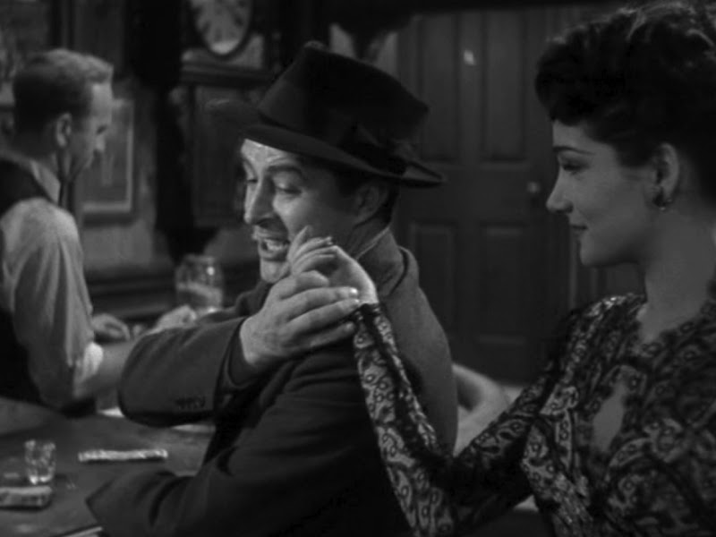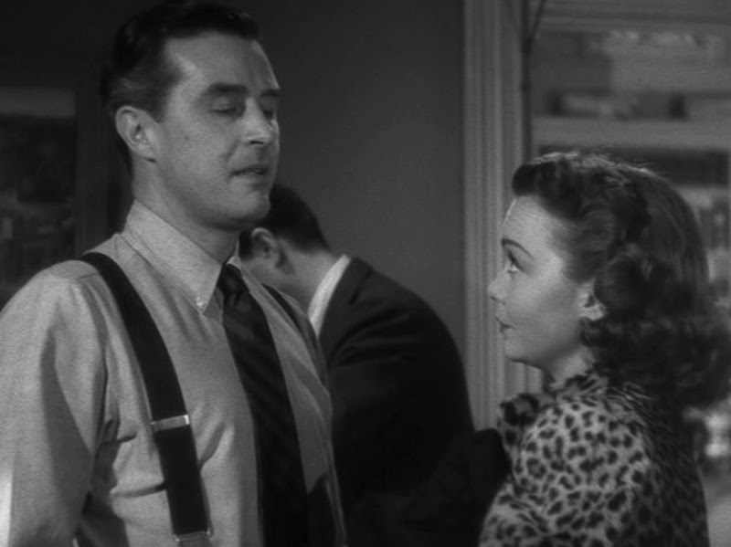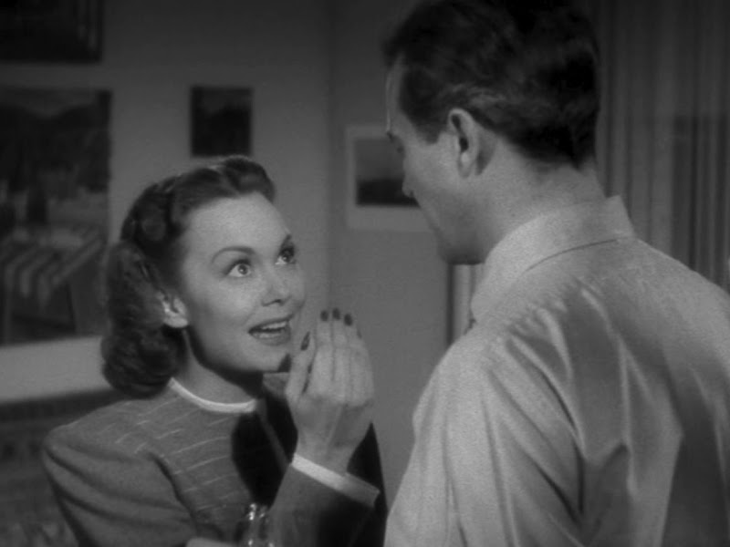 Don and Helen’s kiss is too precise, almost clinical. They mouths touch — but nothing else. He does not want to acknowledge their intimacy. So her apparent coercion seems to be a way to counter his apparent resistance. The film plays with the distance that Don imposes on those around him. Later, in the bar, the insinuating Gloria (Doris Dowling) moves behind him when he is seated and uses a single finger to briefly touch his neck (fig. 2a). He interrupts the movement by grasping her hand (fig. 2b). Don avoids contact and closeness, whatever dissolves his isolation and makes him feel vulnerable and connected (vulnerable because connected).